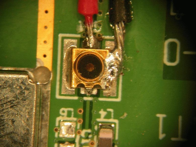Above is the aftermath of moving the two capacitors. These are surface mount capacitors, so they're tiny. I used a special method known as the "pump a boatload of heat into it" method to get the capacitors off their stock pads. There are probably better methods out there, but this one used all the tools I had at hand, which consisted of a 30 watt soldering iron with a pointy tip and a pair of fine tweezers. A dissecting microscope or some sort of maginifying glass is a must-have item so you can see what you're doing. The capacitors have solder all over their ends, so you at least have a decent sized target for the soldering iron tip. This soldering job looks like hell, but it works.