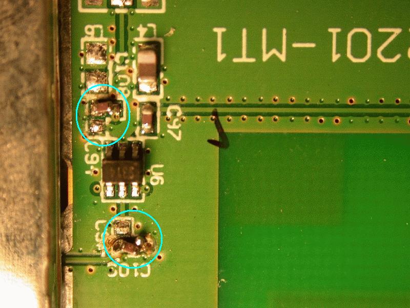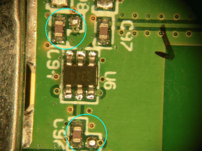 Above is another picture with the two capacitors that we settled on moving circled in blue. They will both be rotated 90 degrees so they attach to the solder pad to the right of each capacitor. The manufacturer was nice enough to provide cryptic white outlines of where the capicitors might be assembled at the factory, and it was based on these that we made our educated guess. If you trace the two unused solder pads in the circles to the underside of the board you will find that they are connected to each other with a copper trace, which was another useful clue for us.
