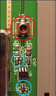 Above is a closeup of where we'll be working. Note that the card is flipped left to right compared to the first picture. The item in the red circle is presumably some sort of external antenna connector. The two items circled below in blue are the two capacitors that need to be moved to enable that external antenna connector. I have no clue what the other stuff is.